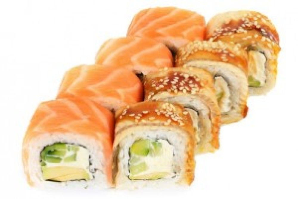 Ролл с лососем с/с, копчёным угрём и начинкой из сливочного сыра, огурца.
