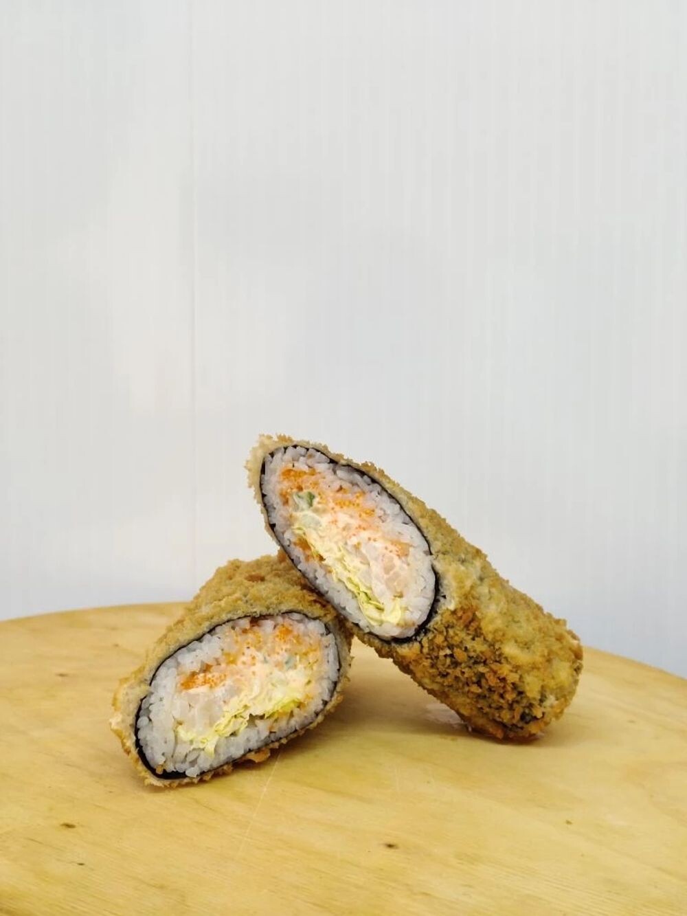 С кальмаром, пекинской капустой,огурцом, спайси соусом и икрой масаго. Обжаренный в кляре и сухариках панко. Подаётся ненарезанным в индивидуальной упаковке, как разновидность шавермы.